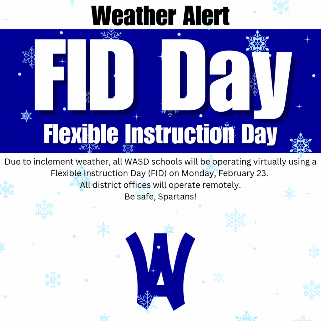 WEATHER ALERT: Monday, February 23 FID Day Due to inclement weather, all WASD schools will be operating virtually using a Flexible Instruction Day (FID) on Monday, February 23. All district offices will operate remotely.Be safe, Spartans! February 22, 2026